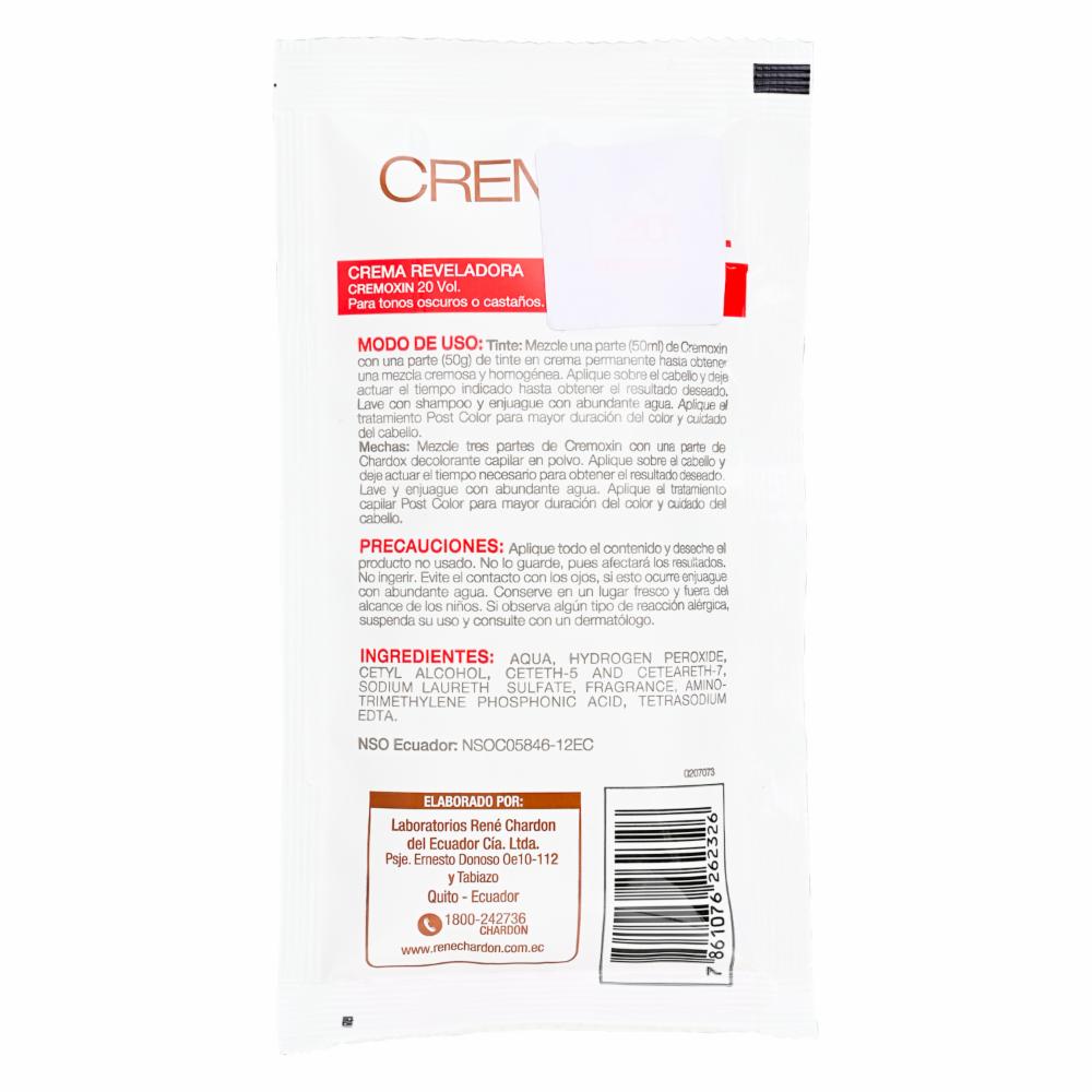 • La crema reveladora CREMOXIN de 20 volúmenes en presentación de 50 ml está formulada para mezclar con tintes permanentes, proporcionando una aclaración de hasta 2 tonos en bases claras y 1 tono en bases oscuras