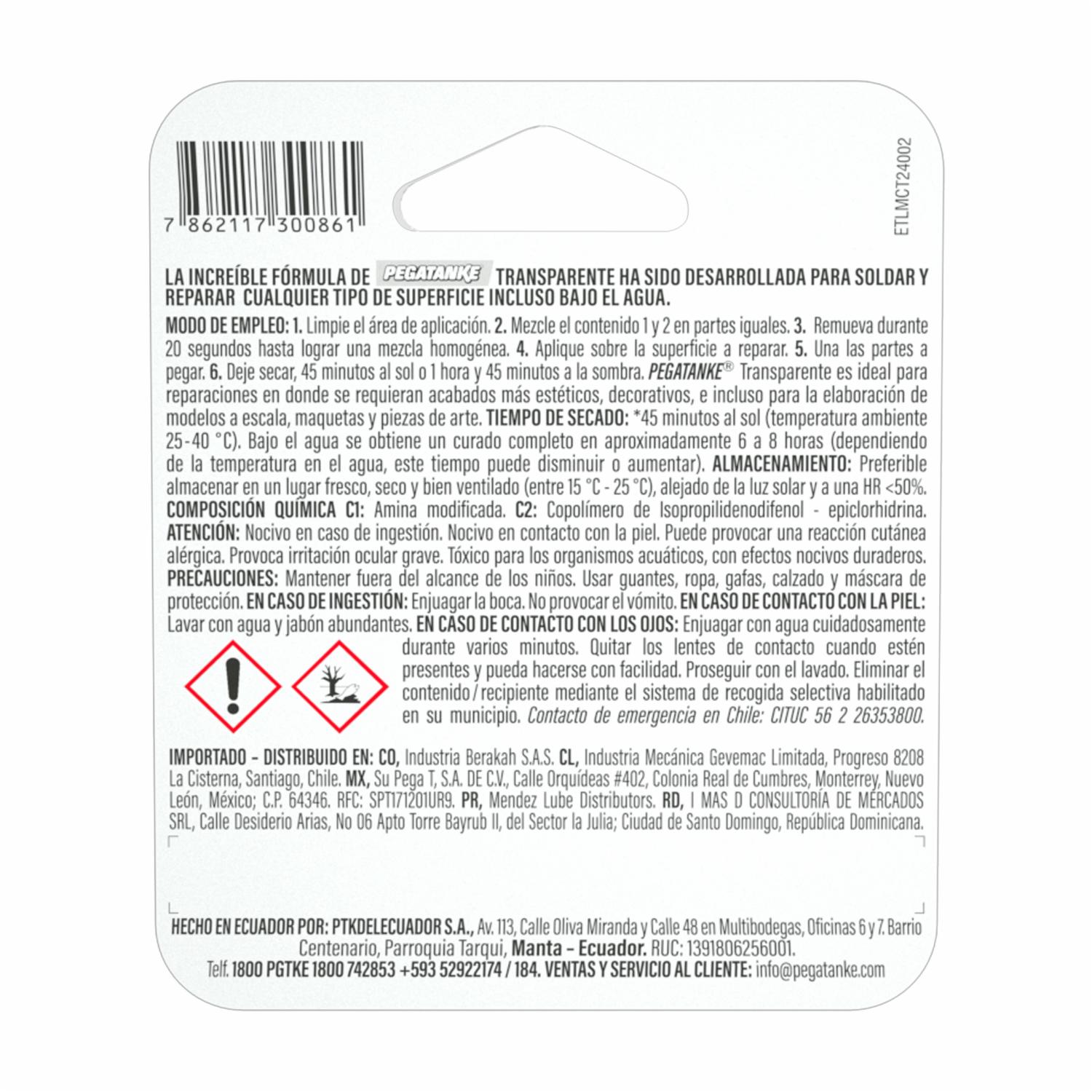 - Pegamento epóxico profesional transparente PEGATANKE®, diseñado para reparaciones invisibles en industrias como automotriz, naval, eléctrica y construcción. Resiste altas temperaturas y tensión, ideal para proyectos personalizados de artesanos como joyas, muebles y esculturas. Se puede aplicar sobre cualquier superficie; vidrio, plástico, cerámica, metal, madera, incluso bajo el agua. Perfecto para reparar faros, micas, defensas, artículos del hogar y grietas