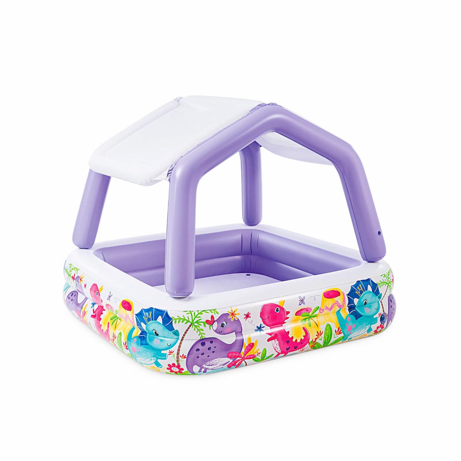 - La piscina está decorada con peces exóticos, incluye un techo para protegerse del sol. De esta forma, ¡los niños podrán disfrutar de un baño seguro, refrescante y divertido! Con una capacidad de 280 litros, nivel de llenado de 24 cm y su Tamaño: 157x157x122 cm