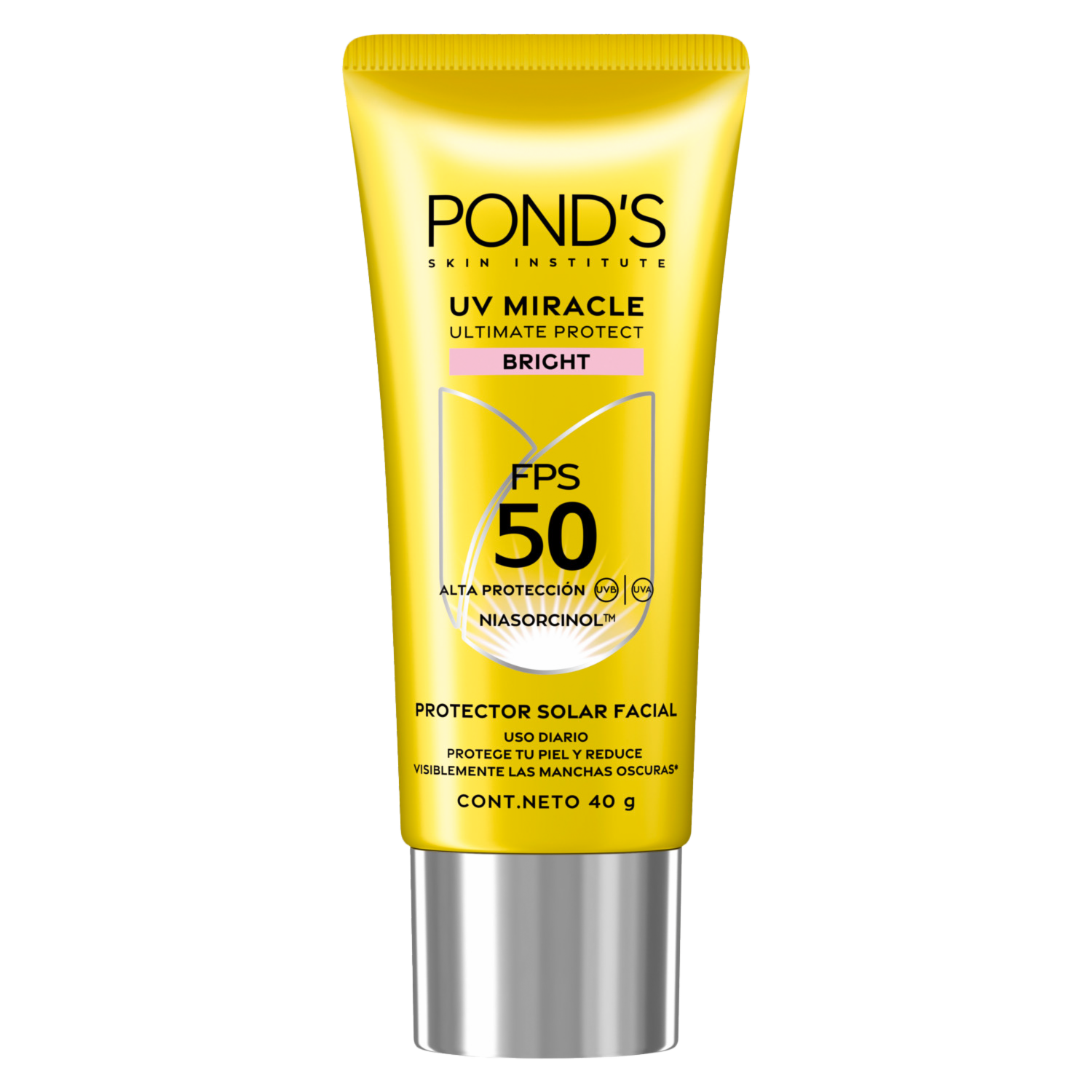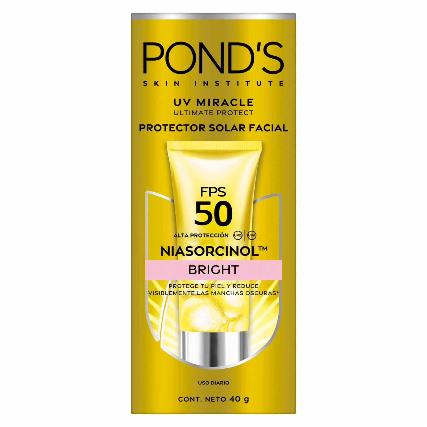 - Protector Solar Facial FPS 50 UV Miracle Bright de PONDS en presentación de 40G. Ideal para uso diario, elaborado con ingredientes seleccionados que brindan beneficios visibles desde el primer uso
