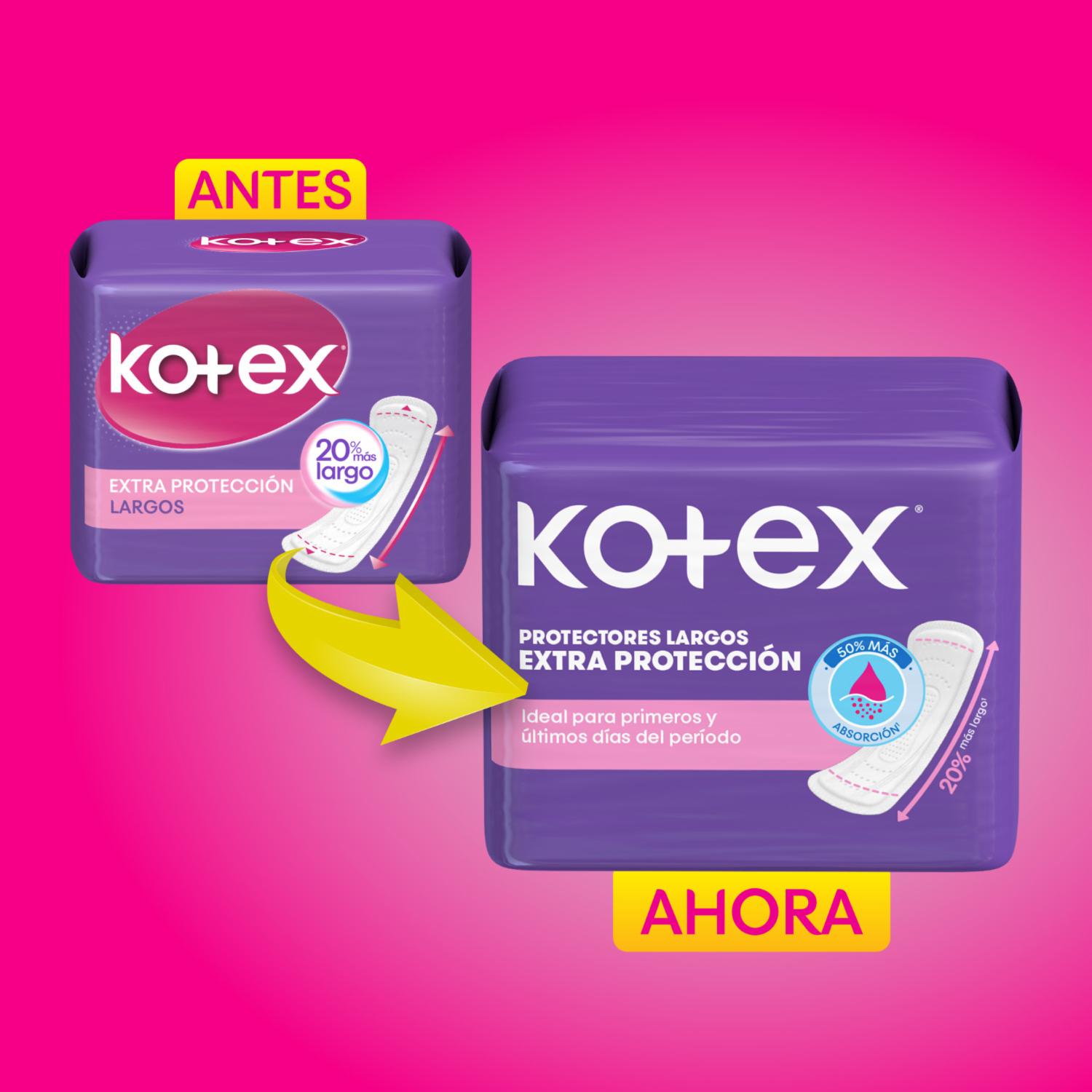 - Protector Diario Kotex ® Extra Protección. Gel absorbente: cuenta con un núcleo que brinda una absorción mejorada ( vs Prot Regular). Extra protección: 20% mas largo* ( vs PD Cuidado Diario) que asegura una mayor área de adhesión a la ropa interior y por lo tanto también una mayor área de protección. Perfecto para los días de poco flujo menstrual