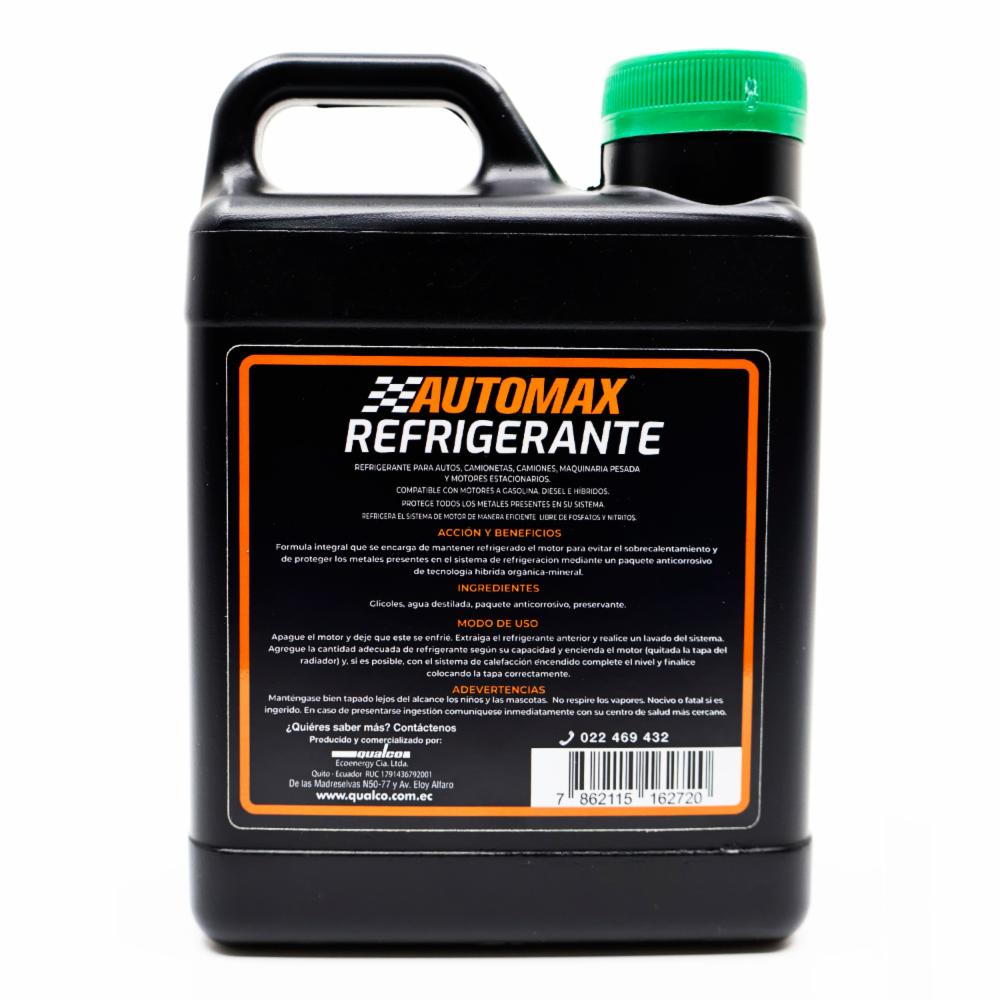 REFRIGERAANTE AUTOMAX : Refrigerante para radiador tecnología hibrida VERDE Diseñado para proteger el motor y cuidar el sistema de refrigeración de vehículos permitiendo un mayor punto de ebullición que el agua. El refrigerante cuenta con un paquete anticorrosivo de vida extendida, que incluye el uso compuestos orgánicos y minerales que protegen los diferentes metales y materiales presentes en el sistema de refrigeración