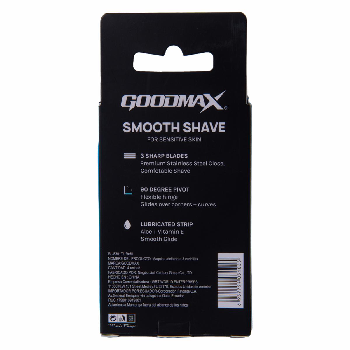 Cartuchos de repuesto diseñados para la afeitadora 4 X GOODMAX, ofreciendo un afeitado suave y preciso. Cada cartucho cuenta con cuatro hojas de precisión y una tira lubricante con aloe vera y vitamina E, ideales para pieles sensibles. Su instalación es sencilla: solo retire el cartucho usado y encaje el nuevo hasta escuchar un clic