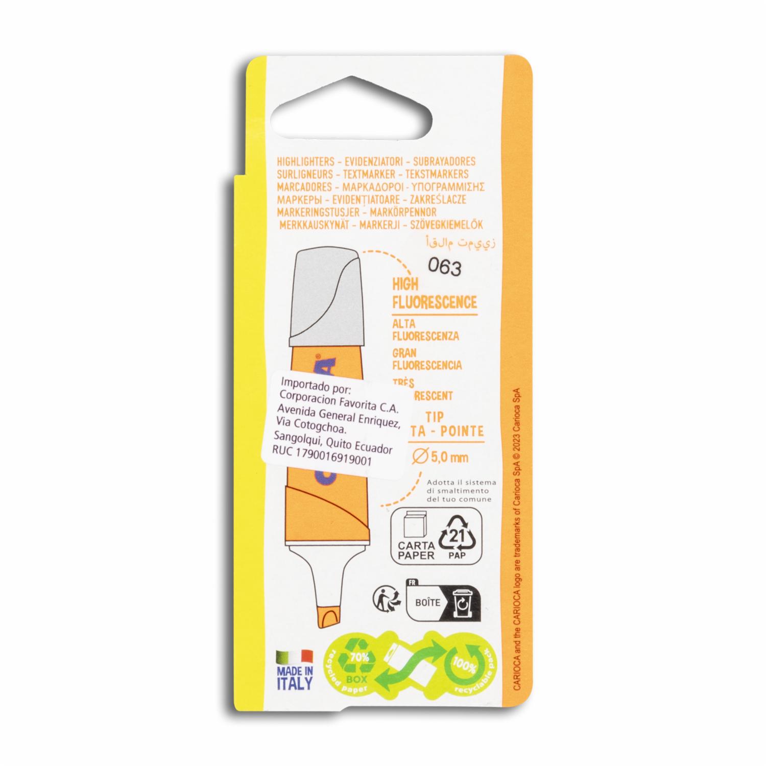 - ¡Ilumina tus ideas con el Resaltador Carioca Fluorecente en color amarillo! Este resaltador fluorescente destaca por su tinta de alta luminosidad, ideal para resaltar textos y notas importantes