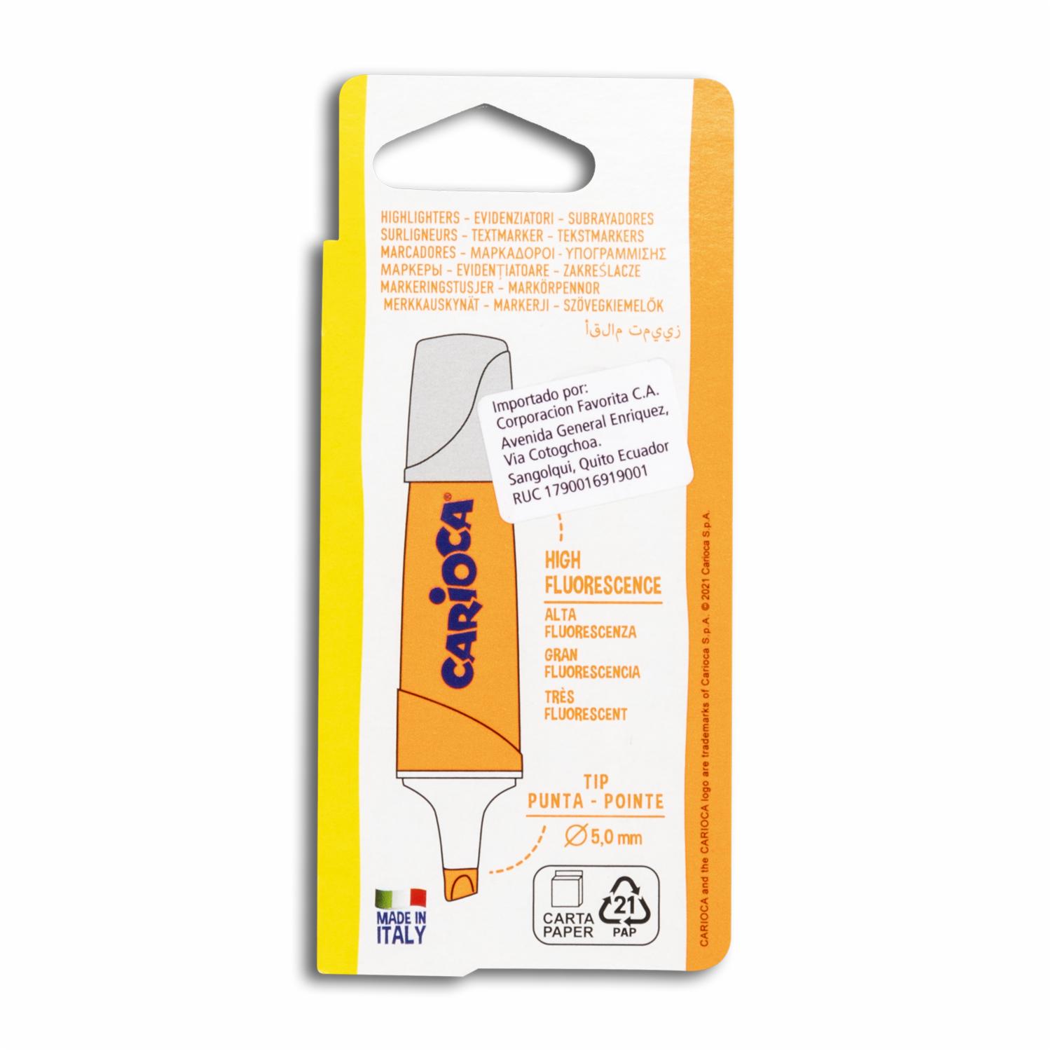 - ¡Destaca tus ideas con el Resaltador Carioca Fluorescente en naranjaEste resaltador fluorescente se destaca por su tinta de alta luminosidad, perfecta para resaltar textos y notas importantes