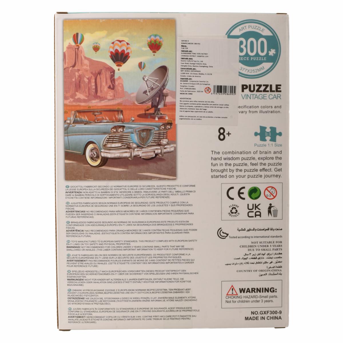 - ¡Viaja al pasado con estilo armando el rompecabezas Vintage Car! Con 300 piezas y una ilustración artística que combina un auto clásico, globos aerostáticos y un paisaje desértico lleno de color, este puzzle ofrece horas de diversión mientras desarrollas concentración y creatividad. Perfecto para relajarte y compartir en familia. Tamaño final: 37.7 x 25.2 cm. ¡Arma la aventura con Juguetón, donde cada pieza acelera tu imaginación!