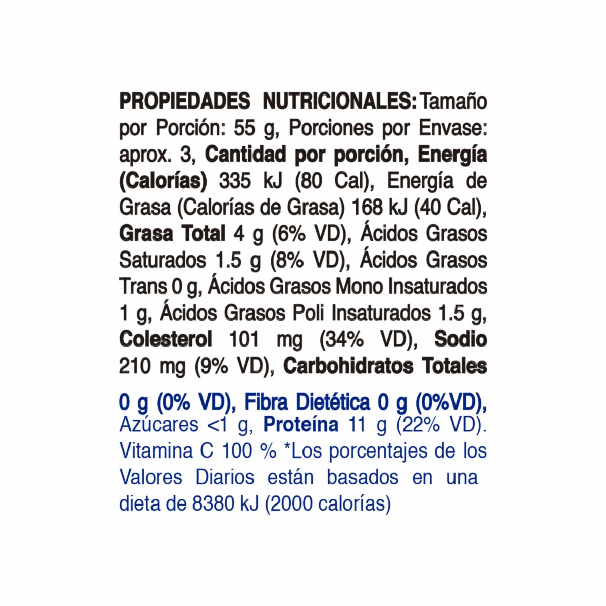 Azúcar, Sal, Carboximetilcelulosa). Contenido Neto 156 g. Peso Drenado 102 g CONTIENE PESCADO, RICO EN FOSFORO, se debe conservar en lugar fresco y seco. Una vez abierto cambiar envase y refrigerar