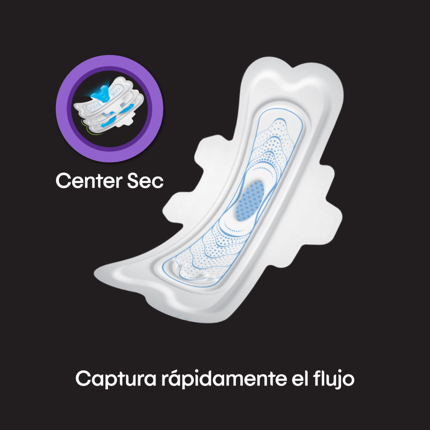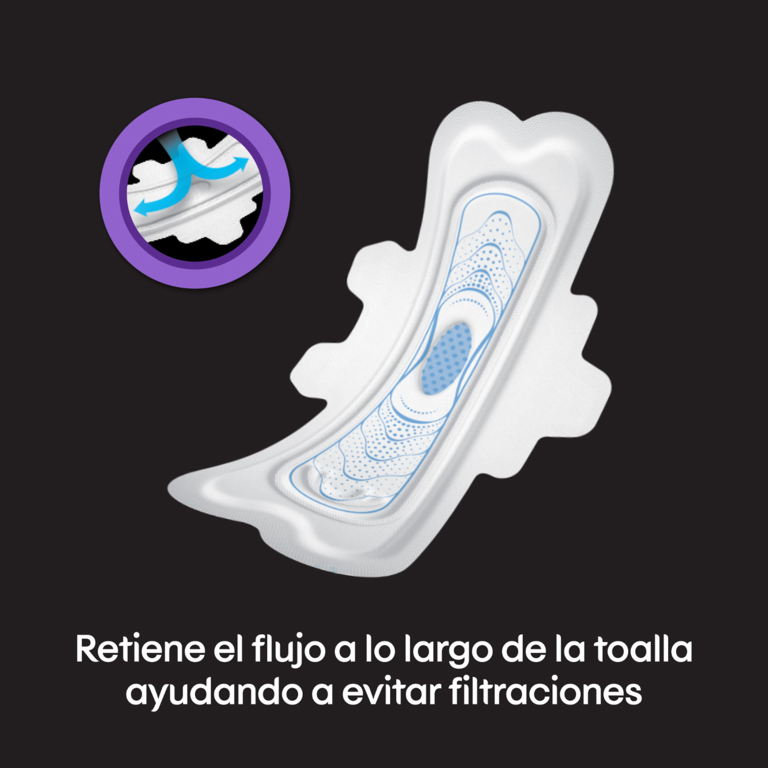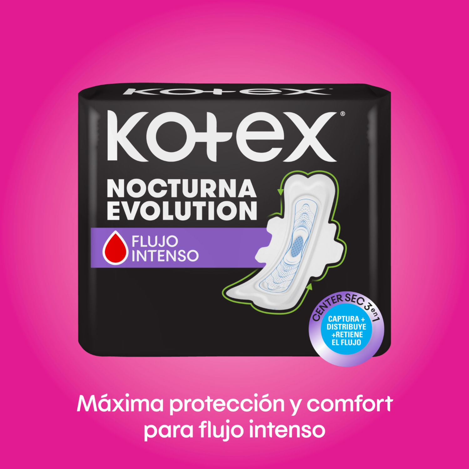 Kotex® Nocturna Tela. Con Instacentro, que absorbe rápidamente el flujo y lo distribuye a lo largo de la toalla. Forma más anatómica, más ancha atrás, para absorber el flujo y dejarte cómoda toda la noche. Sus alas inteligentes se ajustan perfectamente al cuerpo para que la toalla no se mueva