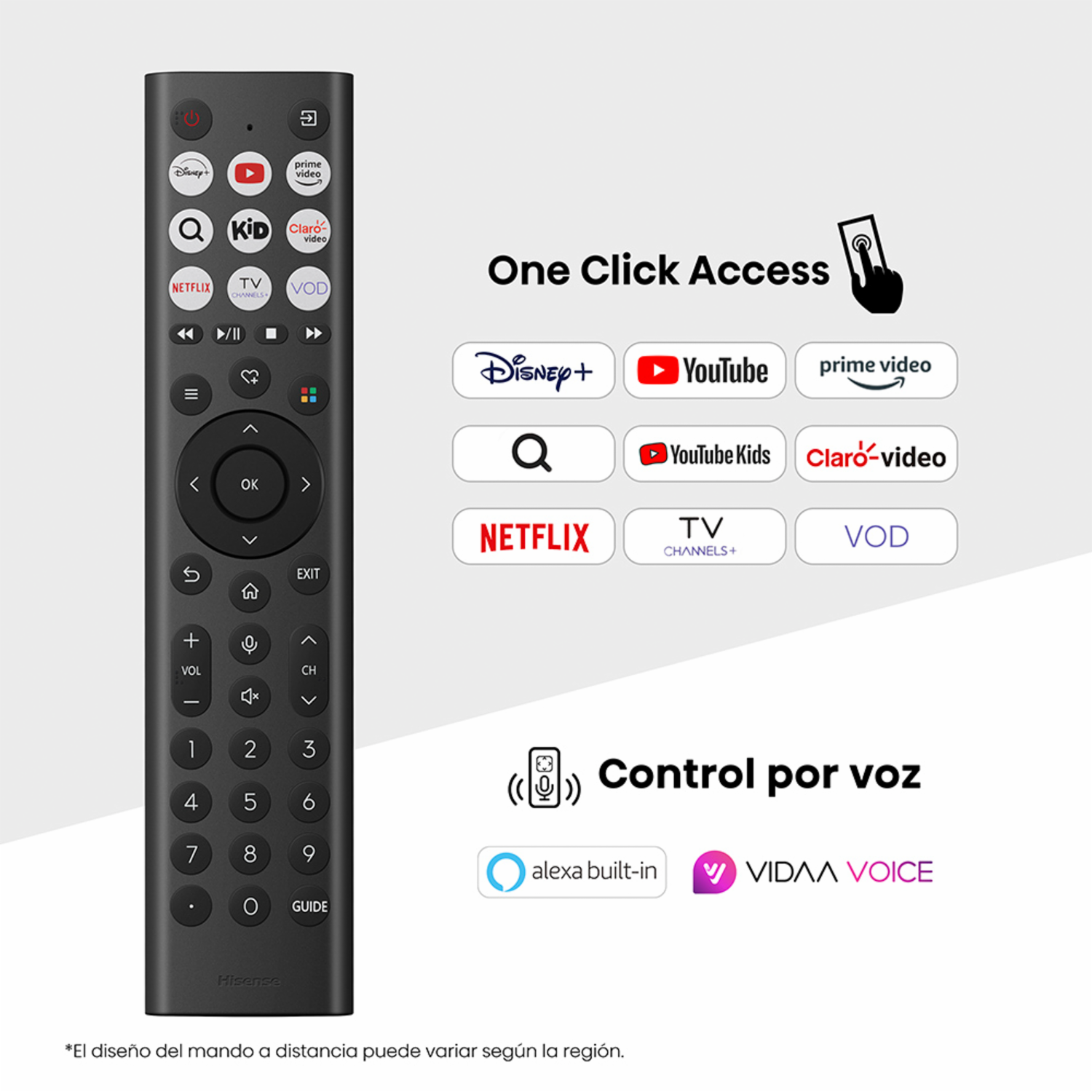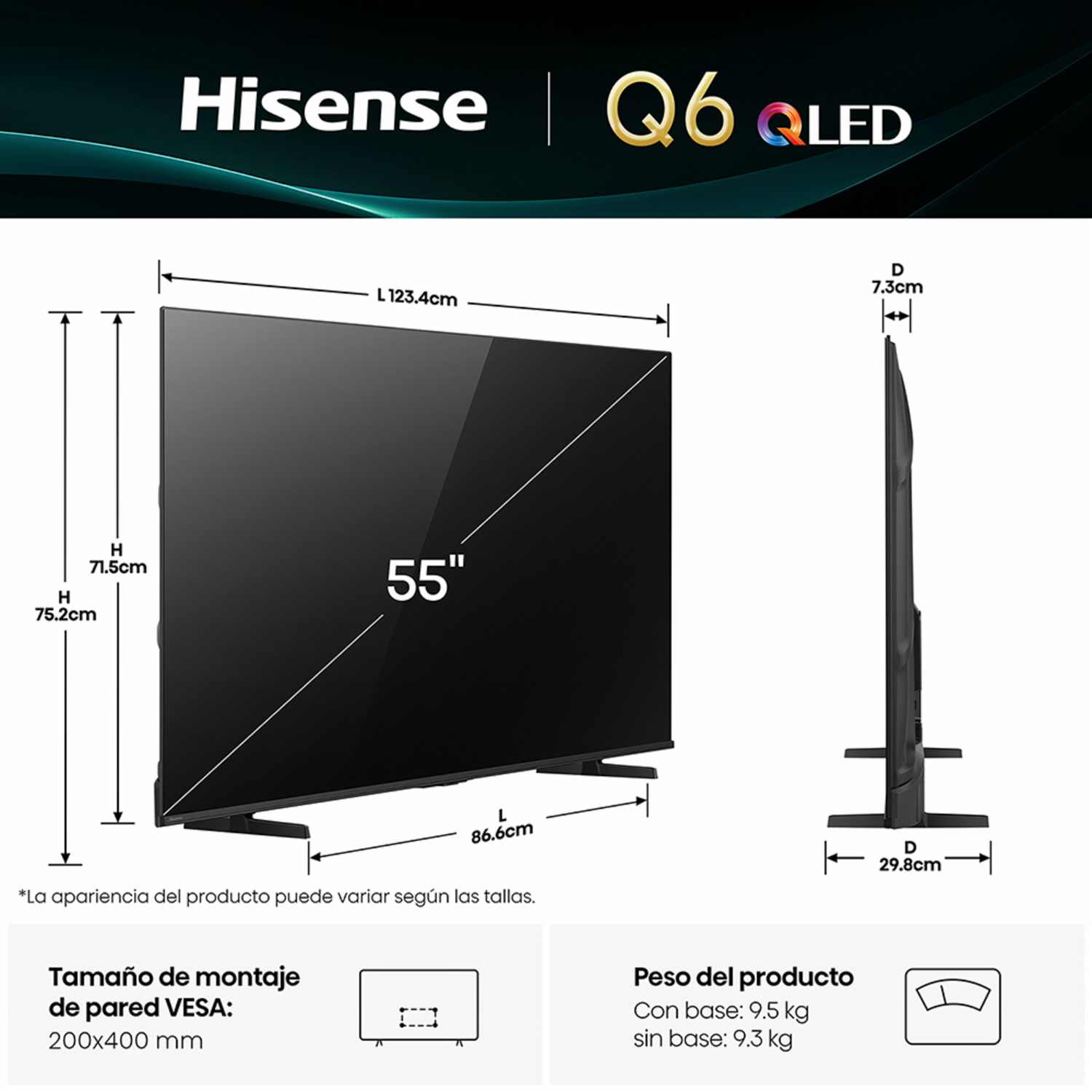 Ofrece imágenes más vívidas y realistas gracias a su tecnología QLED 4K con procesamiento inteligente por IA. Características - Pantalla 55 QLED 4K UHD - AI Picture Quality - Dolby Vision y Dolby Atmos - Modo Cineasta y Game Mode con HSR 120 y VRR - Sistema VIDAA U9 - Bluetooth 5.3 y Wi-Fi doble banda - AirPlay y Apple HomeKit Incluye - Control remoto