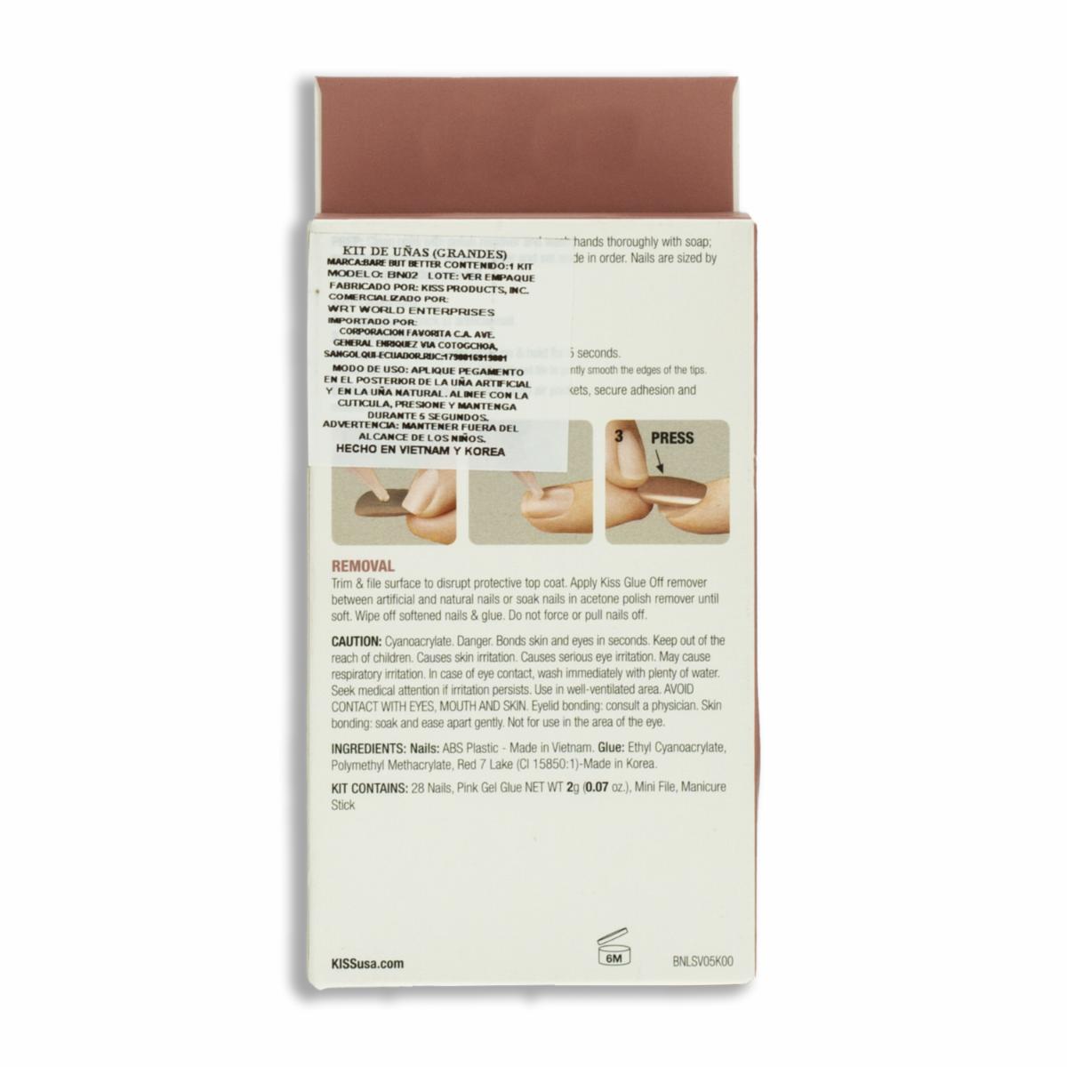 - Las Uñas Postizas Grandes Bare But Better Trunude KISS de 28 unidades ofrecen un look natural y sofisticado en un elegante tono nude