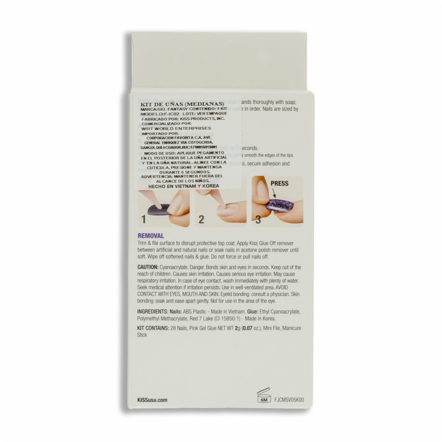 - Las Uñas Postizas Medianas Gel Fantasy Jelly Color Morado KISS de 28 unidades ofrecen un acabado brillante y translúcido con efecto gel en un vibrante tono morado
