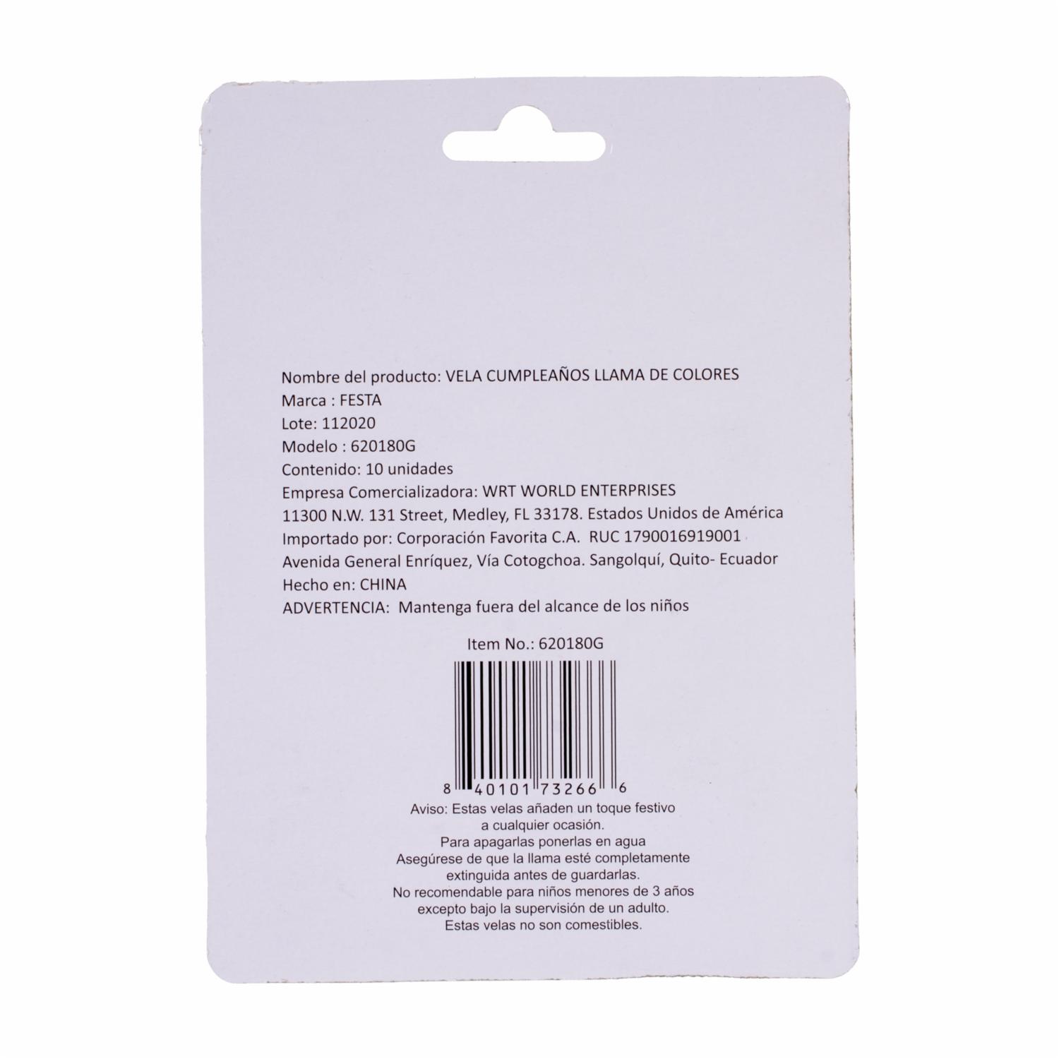 Vela Cumpleaños Llama Colores FESTA X 10 Unidades