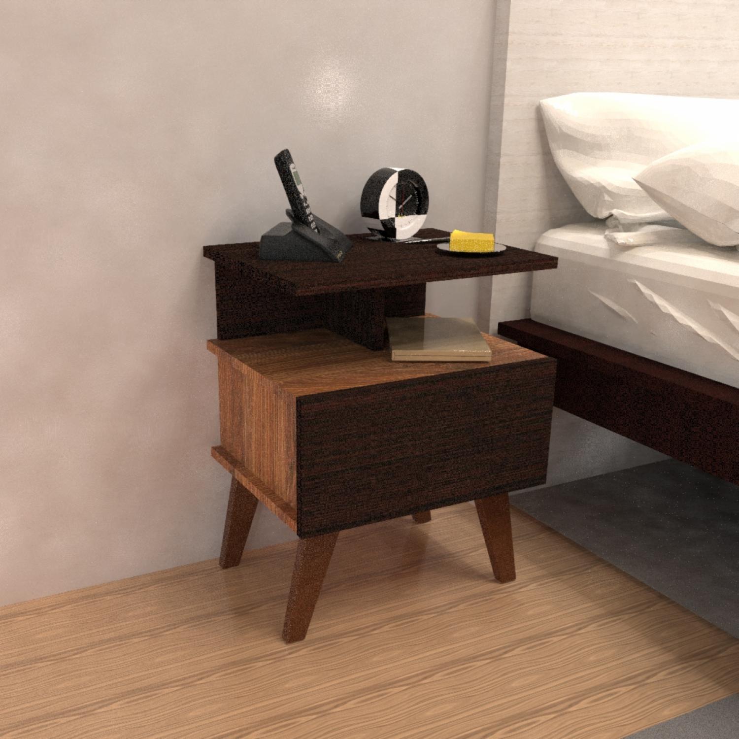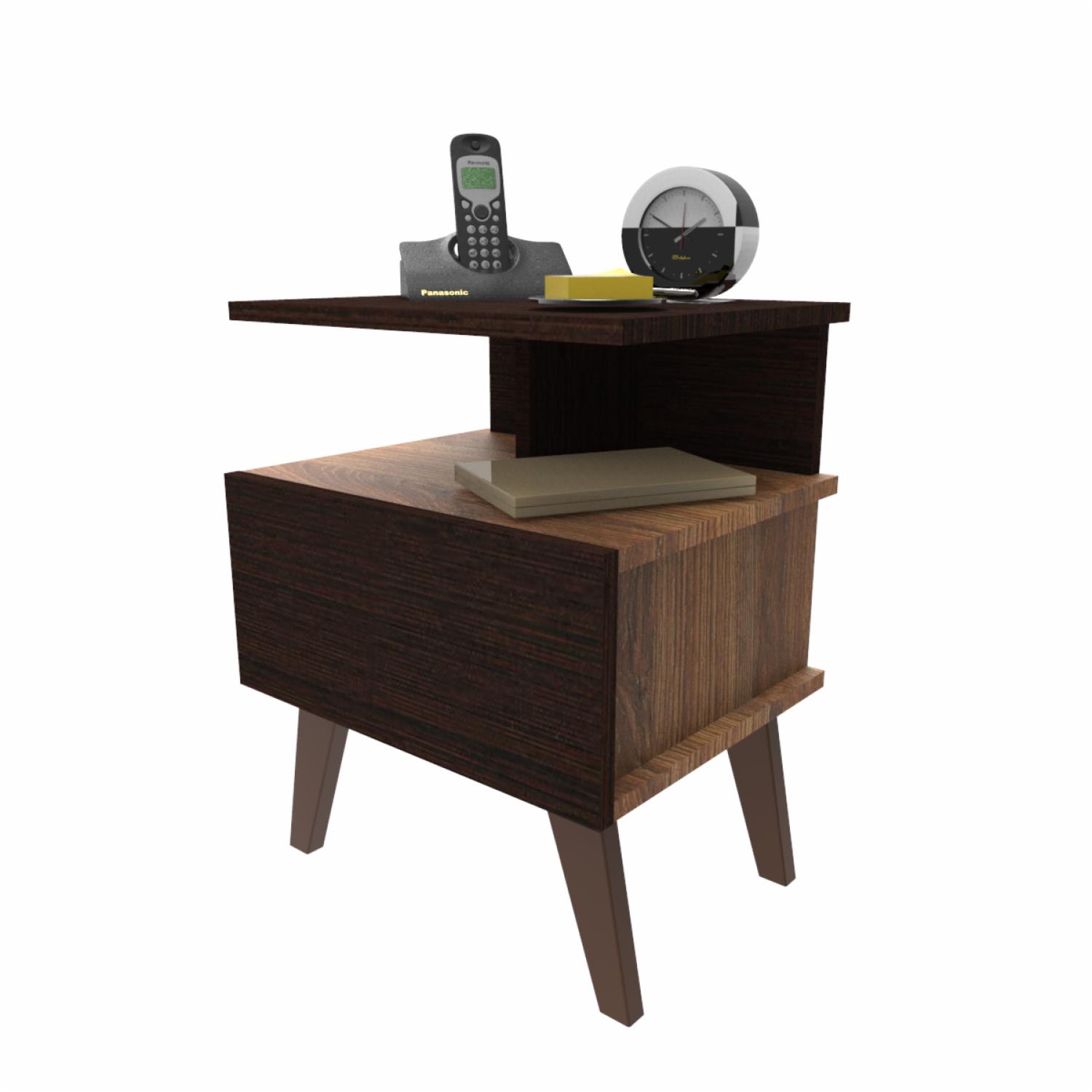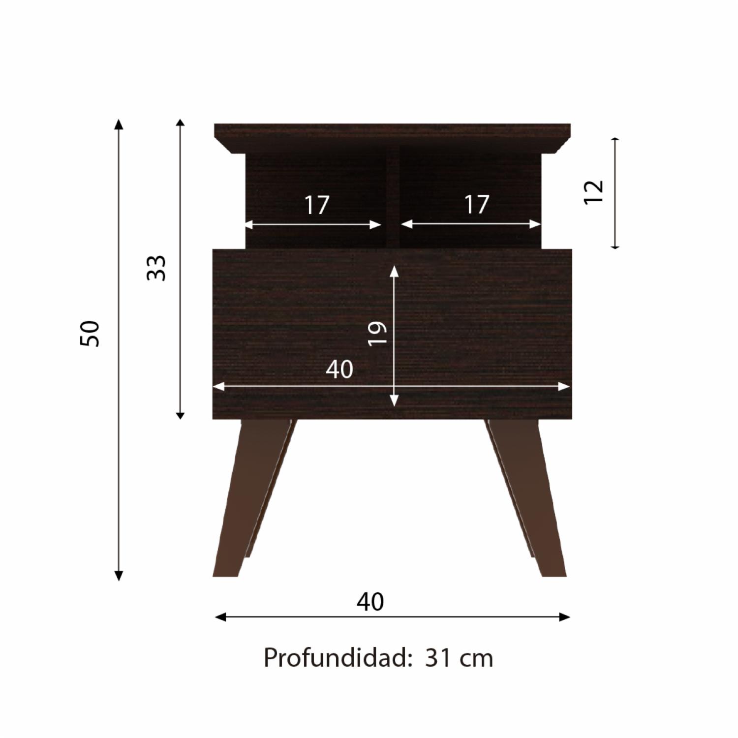 - Cuenta con una repisa superior que soporta hasta 5 kg, bajo a ella se encuentra un espacio adecuado para organizar artículos necesarios para antes de dormir, un cajón con juego de rieles de extensión mini de 30 cm que soporta hasta 10 kg, en su base disponemos de patas se encuentran patas de 175 mm de altura color café que soporta hasta 35 kg