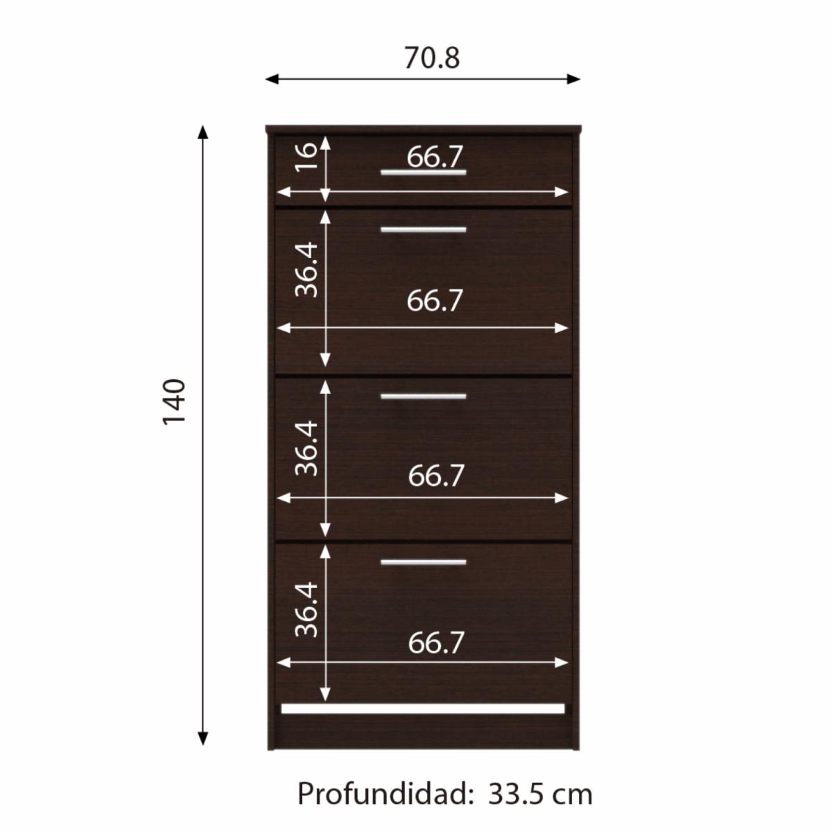 - Contiene un cajón superior con un juego de rieles de extensión mini de 30 cm que soporta hasta 10 kg, mantiene tres puertas para acceder a el area de zapatos cada uno tiene un juego de herrajes para zapato para facil organizacion cada uno soporta hasta 3 kg, la accesibilidad de cada espacio cuenta con una tiradera gris de 128 mm, en su base se encuentran deslizadores negros de 15 mm para el correcto desplazamiento del mueble