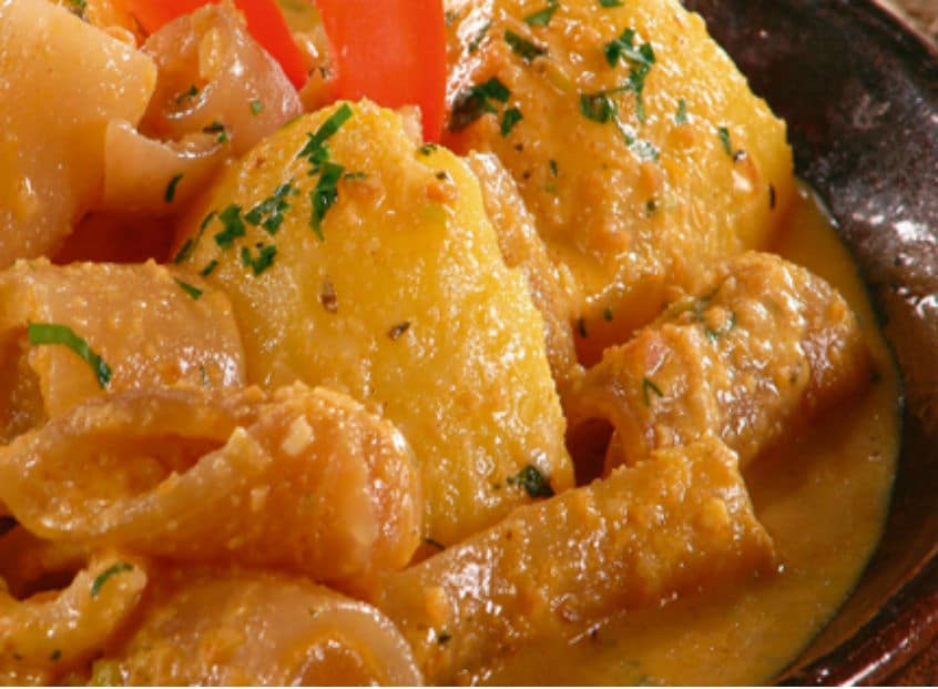 - En una olla hacer un refrito con aceite, cebolla y ajo; sazónalo con sal y pimienta, agrega el maní licuado con la leche, remuévelo y cocínalo durante 5 minutos.